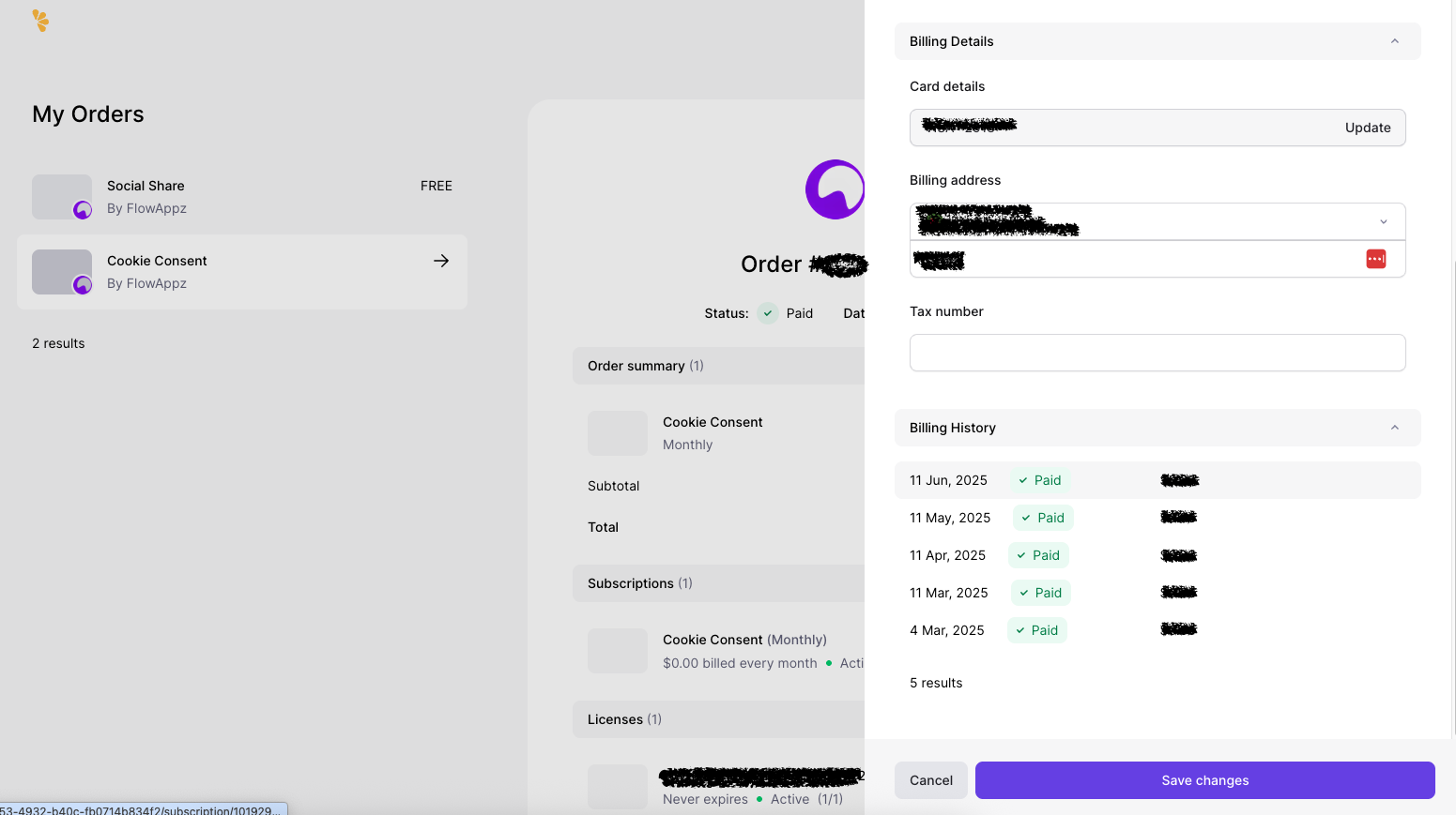 Scroll to the bottom of the order page and click the **“Manage Subscription”** button. This will open a new page where you can update billing details, cancel your subscription, and view all previous charges.
