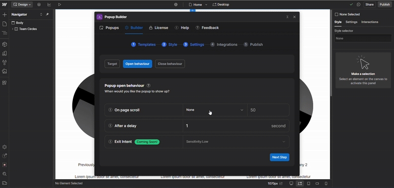 In the Settings tab of the Builder, you’ll find the Open Behavior section, where you can define when the popup should appear to your visitors.