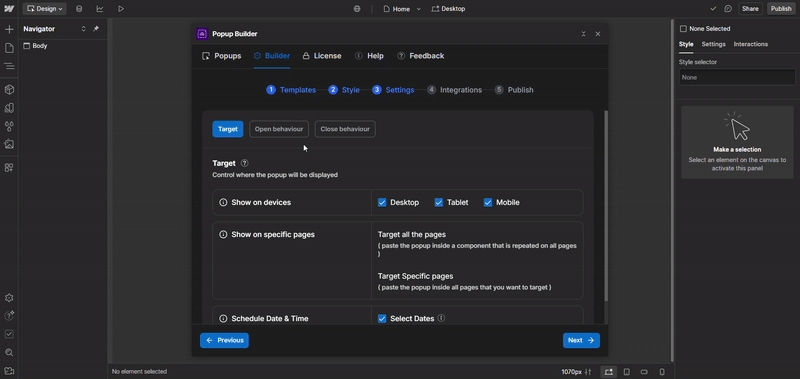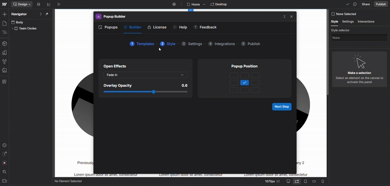 In the Style step of the Builder tab, you can configure the visual appearance and behavior of your popup.