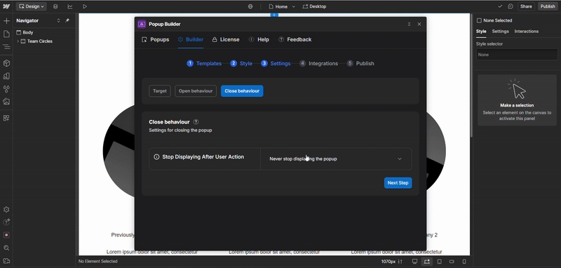 In the Settings tab of the Builder, you’ll also find the Close Behavior section, which controls how and when the popup stops being shown to visitors.