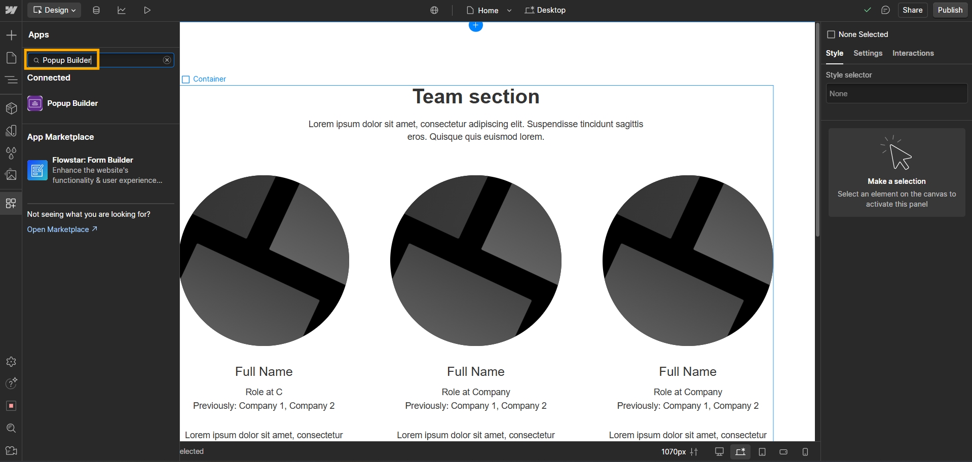 In the Apps panel, use the search bar to look for “Popup Builder”. Once it appears in the results, click on it to open the app page, then click Install to add it to your project. Refer to the screenshot below for assistance.